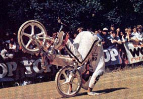 | cherrypicker | A new level of difficulty. The rider places a foot on the rear tire behind the bottom bracket and swings their other leg over the head tube and rests the other foot on the seat tube. Then either using the handlebars for stability or clamping the legs tightly, the rider bounces up and down causing the entire bike to hop on the rear wheel. En français, celui qui cueille les cerises. The cherrypicker is one of Martin Aparijo 's inventions. Derek Oriee, www.vintagebmx.com, february 2005: Urban legend states that Martin Aparijo invented the cherry picker on a skateboard first before converting it to a bmx freestyle trick. Martin Aparijo, BMX Action Bike march 1986: A lot of tricks are invented by making mistakes. You go out and ride, you do something wrong, you make a variation on it and it kinda goes from here. The cherrypicker got invented 'cos we used to do the trick where you ride the bike like a uni-cycle. The thing is you can't actually ride the bike so I thought I'd try and pogo it, so I went in my garage and held on to the roof, stood on my bike and pogoed it. But getting in and out of the cherrypicker was a completely different story. What I'd do was I would just get myself up there and I'd just let myself fall. Then I'd figure out where the pedal is. I'd reset the pedal and get back up. I learnt how to get out the trick before I could get into it. |